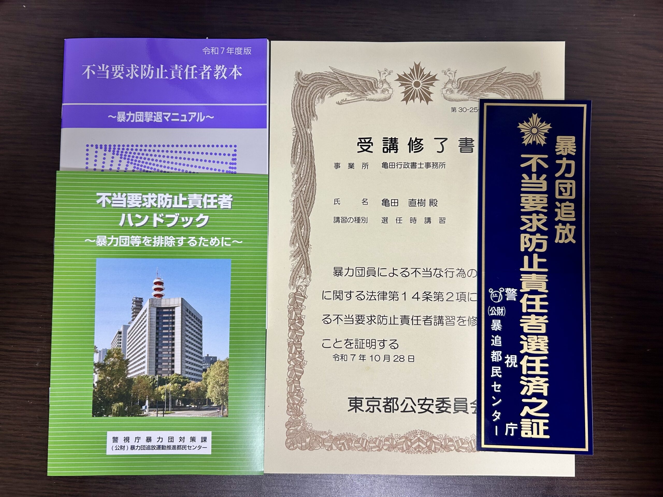 不当要求防止責任者として登録しました|暴力団・反社会的勢力への対応体制を強化 公開日:2025年11月10日 その他契約書関連未分類 東京都北区の亀田行政書士事務所です。このたび当事務所では、不当要求防止責任者として正式に登録を行いました。企業や個人事業者の皆さまが、反社会的勢力や暴力団などからの不当要求に巻き込まれることのないよう、今後も法令に基づい […] 続きを読む